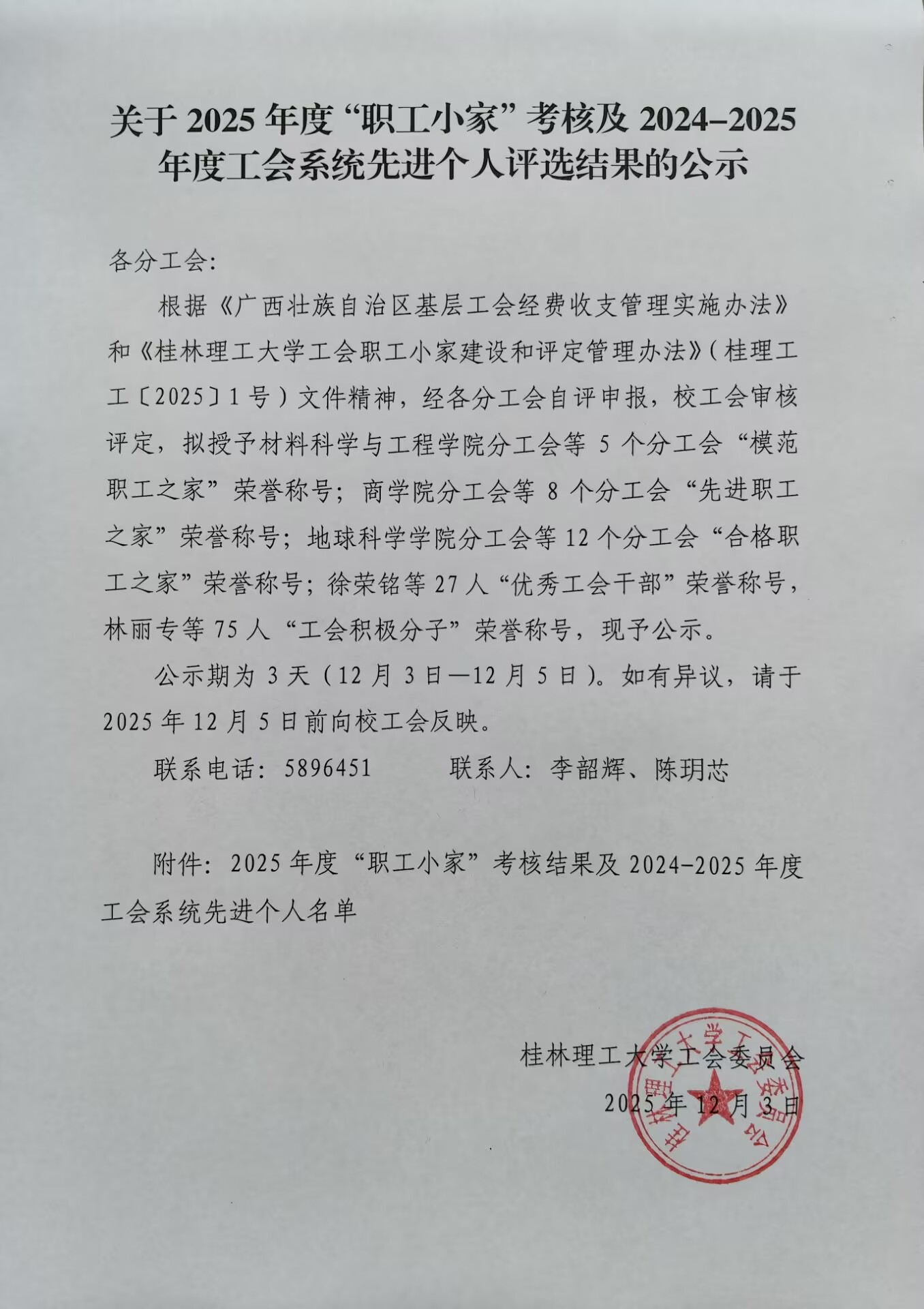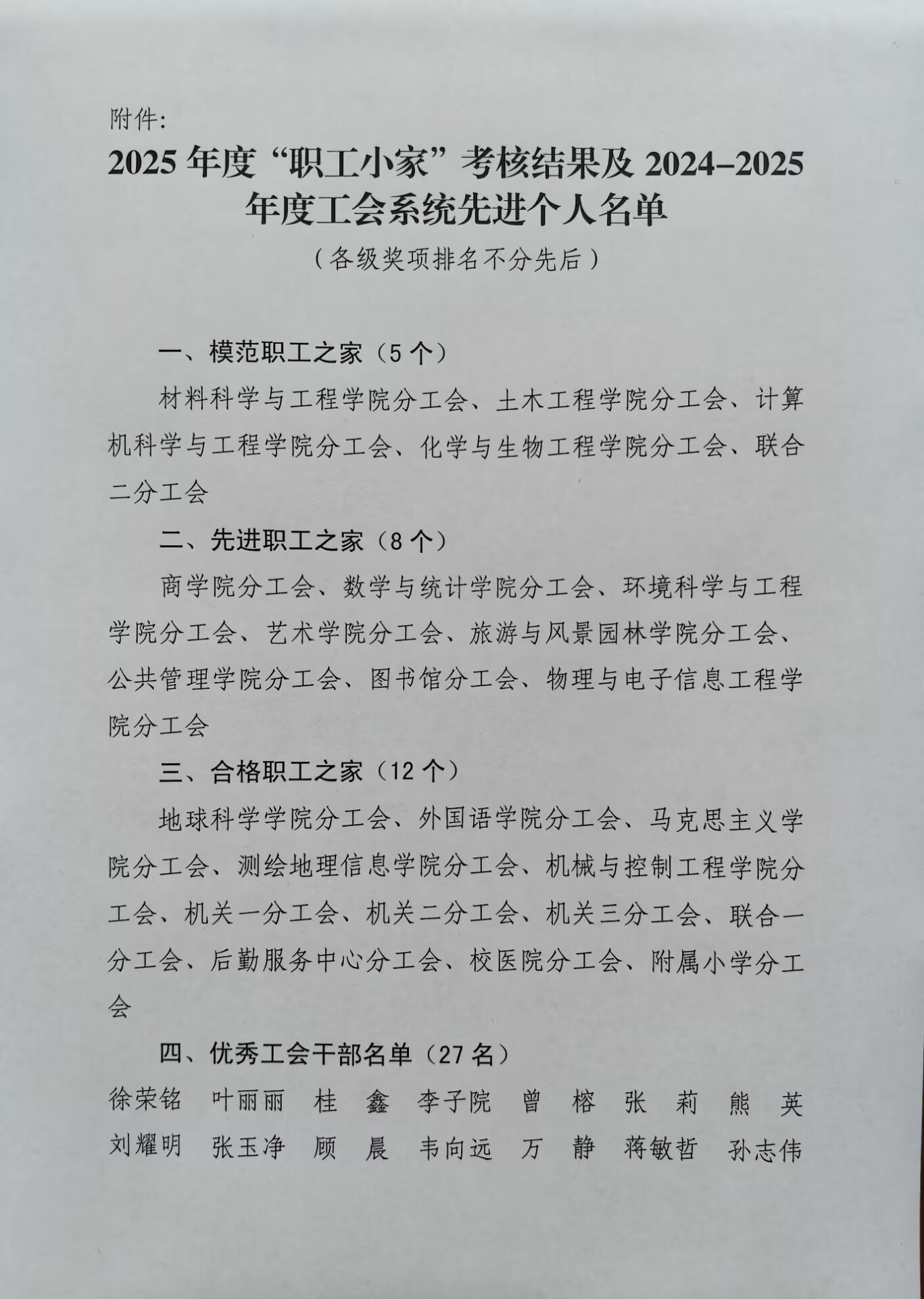 关于2025年度“职工小家”考核及2024-2025年度工会系统先进个人评选结果的公示