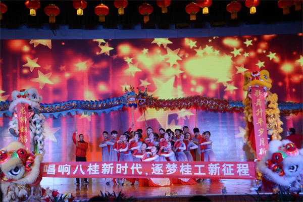 第一篇章“欢乐喜庆年”,在大学生艺术团表演的啦啦操《梦想起航》中拉开序幕,伴随着动感的音乐,艺术团的同学们展现出了桂工人心怀梦想,勇往直前的精神面貌;由联合一分工会、艺术学院大学生艺术团带来的歌伴舞节目《锦绣前程》,反映了我国改革开放四十年来取得的巨大成就和人民群众走向新时代的豪迈之情;由离退处老年大学艺术团带来的歌曲《美丽的漓江河》,歌声宛转悠扬,使人仿佛置身于美丽的漓江河畔;瑶族舞蹈《花瑶帽》,身着传统风格的精美花瑶服饰的表演者,俨然束束耀眼的山花在舞台上灿然绽放。第二篇章“奋进桂工人”,着力体现我校师生艰苦创业,砥砺前行的奋斗精神。情景舞台剧《学在桂工》,为观众讲述了一群桂工学子不断学习成长,挑战自我,实现梦想的过程;由土木与建筑学院分工会带来的原创小品《扶贫路上》展现了我校在脱贫攻坚国家战略中的责任和担当。第三篇章“展望未来创新篇”,留学生艺术团带来的歌曲《家乡的味道》向大家展示了越南的民族风情,唱出了“一带一路”国家民众和中国人民的深情厚谊;教职工艺术团带来的现代舞蹈《挂红灯》,表达了师生员工们内心的喜悦之情,以及对美好生活的向往和祈愿。晚会在热闹欢腾的龙狮表演《龙国梦》中落下帷幕。