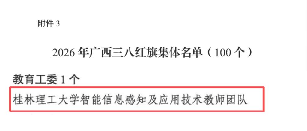 近日,自治区妇联发布《关于表彰2026年广西三八红旗手标兵、广西三八红旗手、广西三八红旗集体的决定》。我校计算机科学与工程学院(人工智能学院)智能信息感知及应用技术教师团队荣获2026年广西三八红旗集体,为教育工委系统唯一获此殊荣的先进集体。